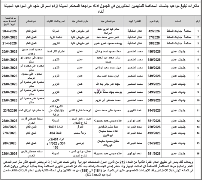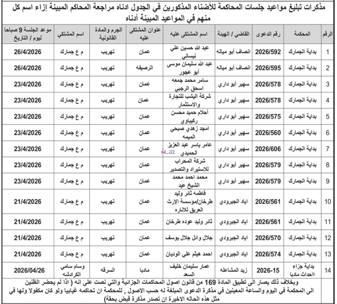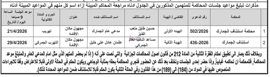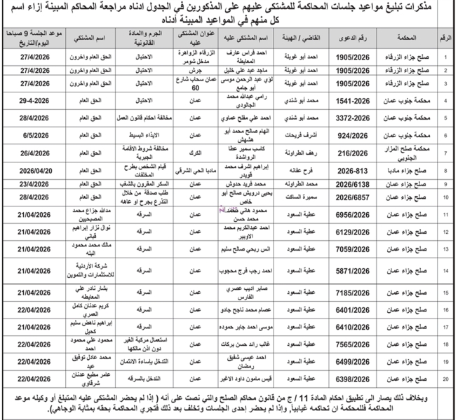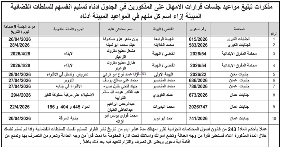 وتأتي هذه المذكرات استنادا لأحكام قانون أصول المحاكمات الجزائية، مشددة على أن عدم حضور المعنيين في المواعيد المحددة سيعرضهم للمحاكمة الغيابية وصدور قرارات قضائية بحقهم وفق القانون.