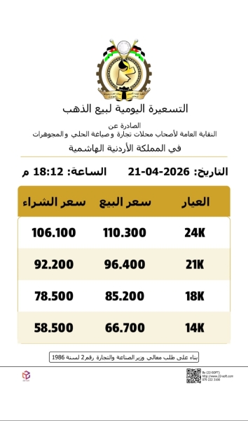 كما بلغ سعر الغرام الواحد من الذهب عيارات 24 و18 و14 لغايات البيع من محالّ الصاغة 110.3 دنانير، و85.2 ديناراً، و67.7 دينارا على الترتيب.
