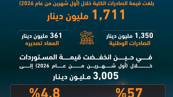 وعليه فان قيمة الصادرات الكلية تكون قد بلغت 1,711 مليون دينار لتسجل انخفاضا طفيفا بنسبة 0.8 بالمئة مقارنةً بنفس الفترة من عام 2025.