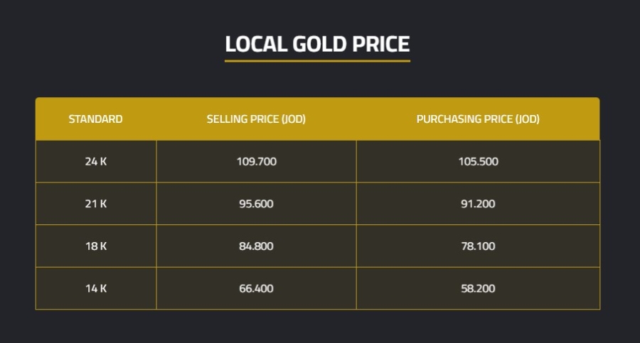 وحسب النشرة التي أصدرتها النقابة العامة لأصحاب محالّ تجارة وصياغة الحلي والمجوهرات، بلغ سعر الغرام الواحد من الذهب عيارات 24 و18 و14 لغايات البيع من محالّ الصاغة 109.7 دينارا، و84.8 دينارا، و66.4 دينارا على الترتيب.