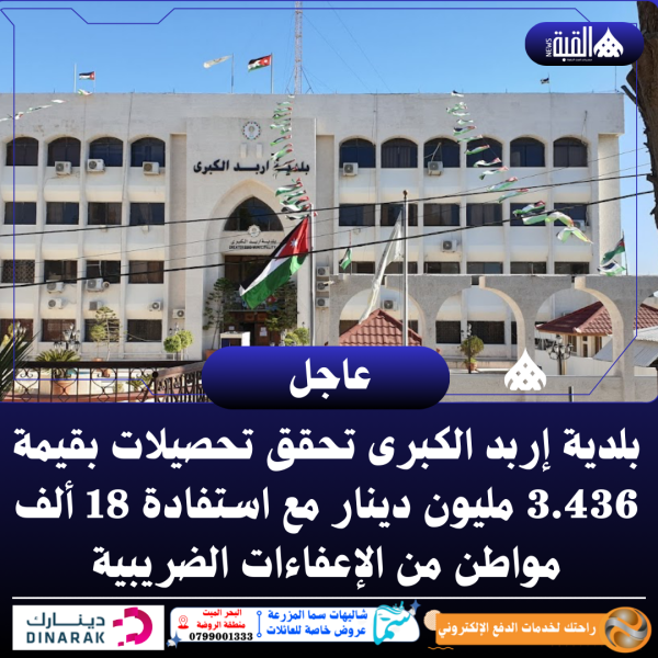 بلدية إربد الكبرى تحقق تحصيلات بقيمة 3.436 مليون دينار مع استفادة 18 ألف مواطن من الإعفاءات الضريبية