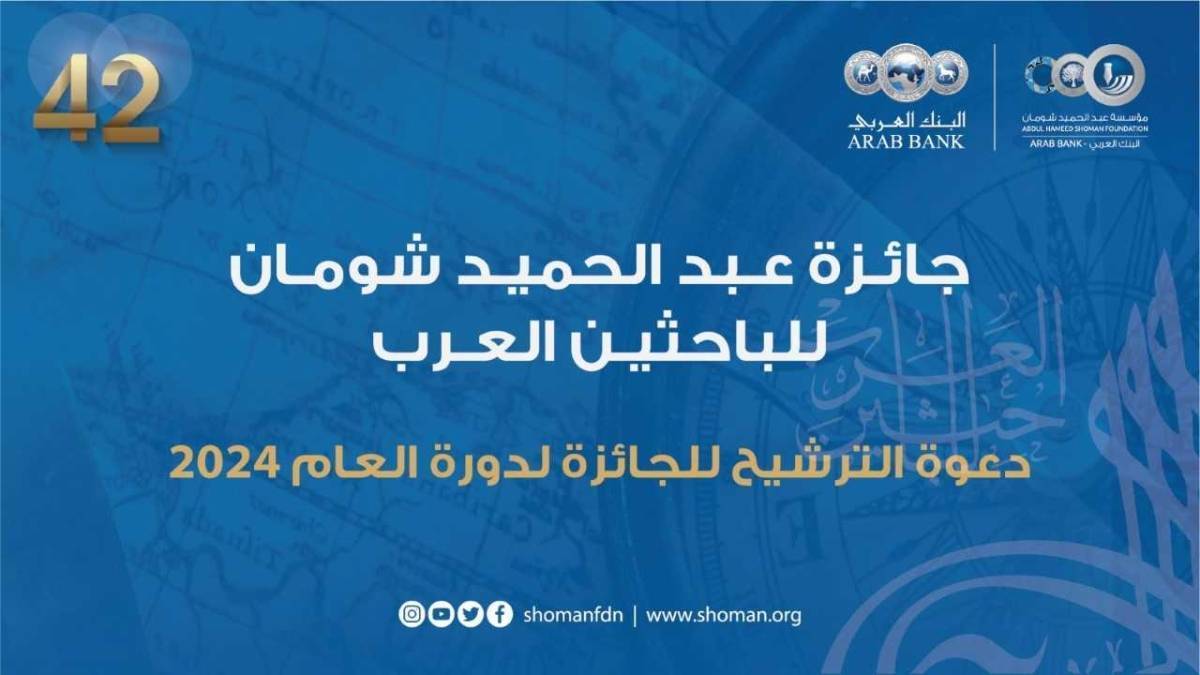 "شومان" تعلن استقبال طلبات التقدم لجائزة الباحثين العرب للعام 2024
