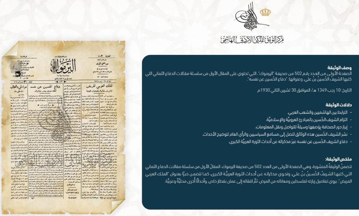 التوثيق الملكي يعرض وثيقة بمناسبة ذكرى وفاة الشريف الحسين بن علي