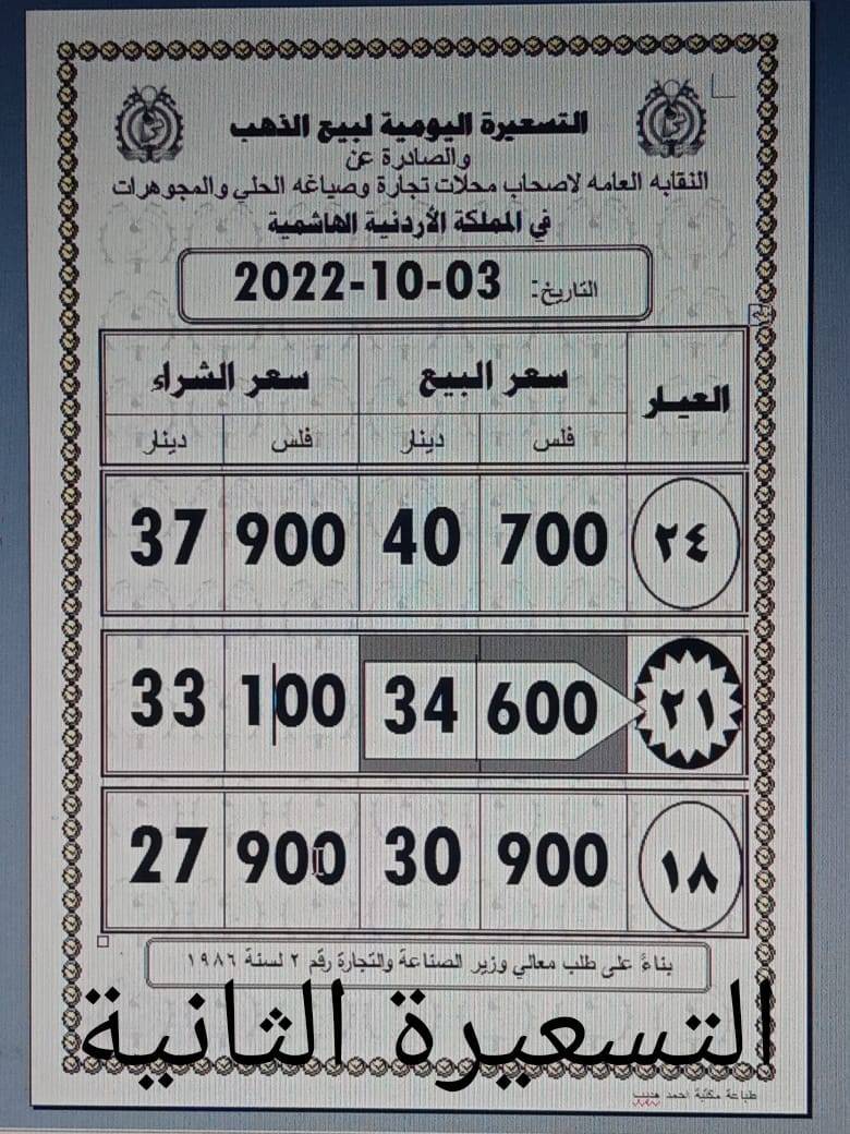 تسعيرة جديدة لاسعار الذهب في الاردن الإثنين 2022-10-03